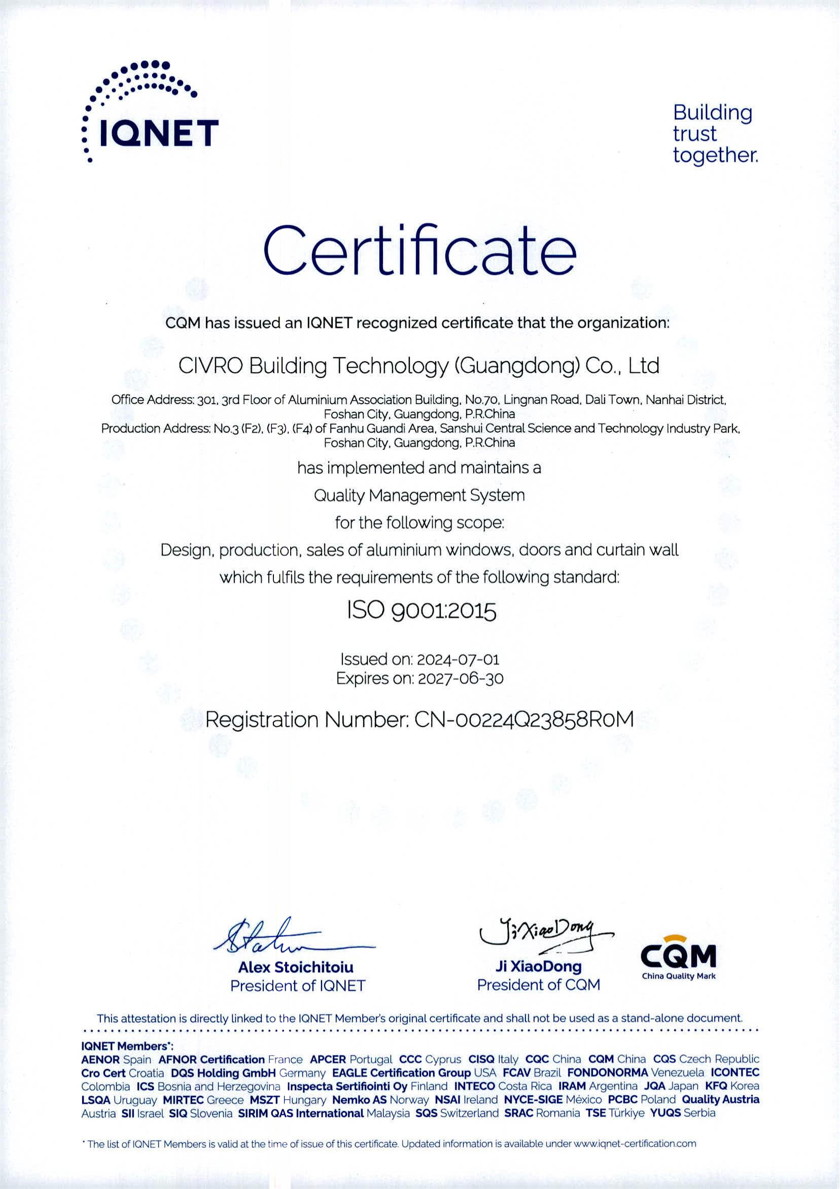 ISO 9001 is the international benchmarks for Quality Management Systems. Certified by CQM (China Quality Mark Certification Group), a member of IQNet, these certifications demonstrate CIVRO’s commitment to consistent product quality, operational efficiency, and sustainable manufacturing practices that meet stringent global regulatory requirements.